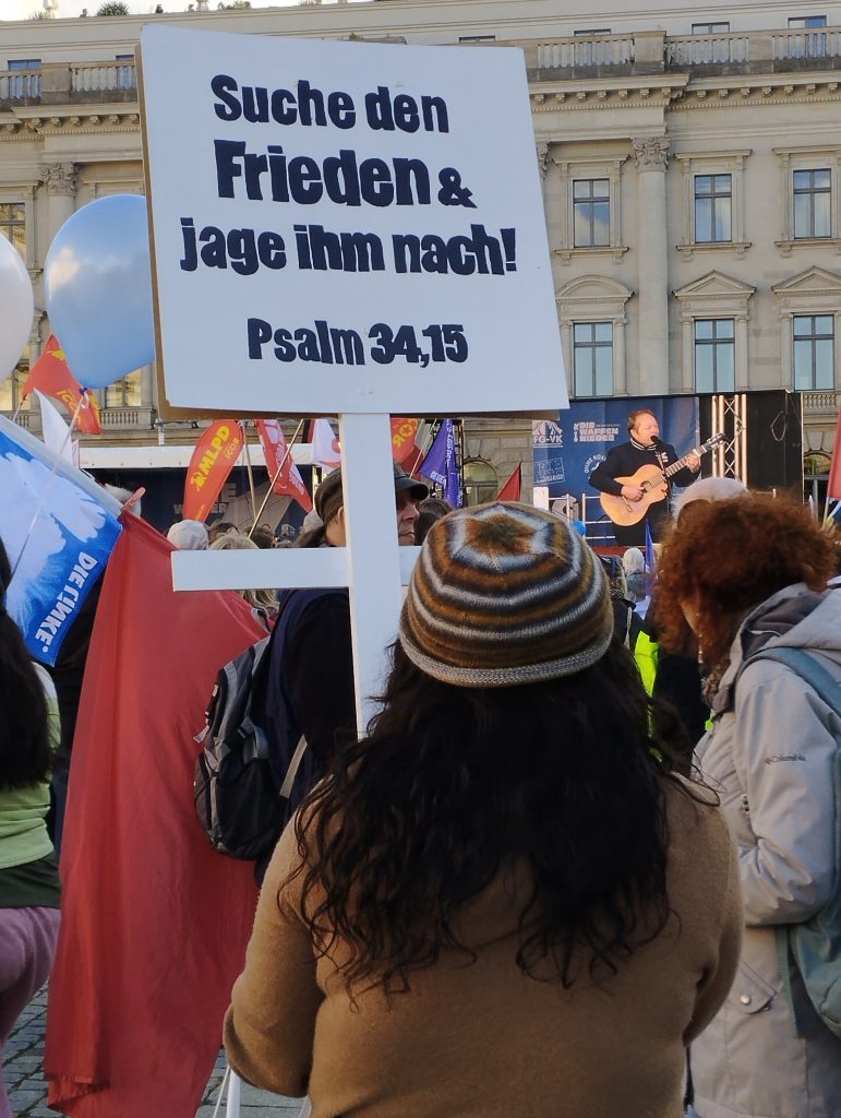 Nach der Auftagktkundgebung ab 13.00Uhr auf dem Bebelplatz an der Strasse unter den Linden in Berlin begann gegen 14.30 Uhr ein großer Demonstrationszug durch Berlin – Mitte. Wer am Strassenrand verharrte konnte einen Zug von ca 45 Minuten Länge an sich vorüber ziehen sehen. Die rund 20.000 Demontranden liefen in 5 Blöcke geteilt. Allen gemeinsam der Wunsch nach Frieden in der Welt. Ein Block – unter besonderer Polizeibewachung – forderte ein Ende des auch durch deutsche Beihilfe ermöglichten Genozid durch den israelischen Staatsfaschismus in Gaza. Der jüdische Musiker Pablo Miro hatte zuvor schon mit seinem Song „Free Palastine“ für Verständigung geworben.