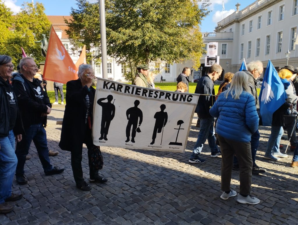 In der Abschlussveranstaltung ab ca 16.30 Uhr sprachen unter anderem 2 Kriegsdienstverweigerer aus der Ukraine und Russland. Laut UN-Charta ist Kriegsdienstverweigerung ein Menschenrecht, welches allerding im Interesse des Kapitals in den einzelnen Staaten sehr unterschiedlich ausgelegt wird. Oft quasi unmöglich gemacht wird. So auch in Russland und der Ukraine. Und auch in weiten Teilen des Wertewestens. So werden hier – auch in Deutschland – Kriegdienstverweigerer aus Russland und teilweise auch der Ukraine nicht als Asylbwerber anerkannt. Ihnen droht die Abschiebung!! In Deutschland gibt es nur 3 Fälle, wo Russen per Gerichtsbeschluss die Anerkennung erhalten haben. Soviel zum realexistieren Rassismus in Deutschland! (der Jüngste, vor wenigen Wochen erst im „Ukrainekrieg“ dem Mammon geopferte Soldat war Geburtsjahrgang 2007!!)