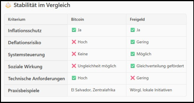 Freigeld bietet aus systemischer Sicht mehr wirtschaftliche Stabilität, da es aktiv gegen Deflation und Inflation wirkt, den Geldkreislauf fördert und soziale Ungleichheiten ausgleicht. Es eignet sich besonders für lokale oder nationale Wirtschaftssysteme, die auf Resilienz und Gemeinschaft setzen.