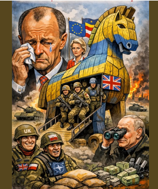 So steht am Ende kein Frieden, sondern ein gut verpackter Vormarsch. Und Merz? Der wischt sich die Tränen ab, richtet die Krawatte und nennt es Verantwortung. Das trojanische Pferd ist längst im Hof und in seinem Bauch die “multinationale Schutztruppe“. Und alle sollen bitte so tun, als hätten sie das Wiehern nicht gehört. Es ist doch bald Weihnachten.
