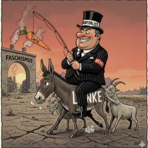 Diese Metapher ist kein Vorwurf, sondern ein Weckruf: Sie soll verdeutlichen, wie leicht sich progressive Kräfte (hier: links und rechts) instrumentalisieren lassen, wenn sie die Mechanismen des Kapitalismus nicht klar erkennen – und wie dringend eine strategische Neuausrichtung nötig ist.