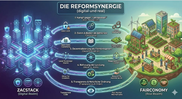 Zacstack ist also die digitale Infrastruktur für eine Fairconomy-Gesellschaft. Ohne digitale Souveränität würde eine Boden- und Geldreform könnte heute nicht umfassend wirksam werden, da wir dann noch über die digitale Schiene (KI-Monopole, Plattform-Gebühren) weiter „ausgebeutet“ würden.